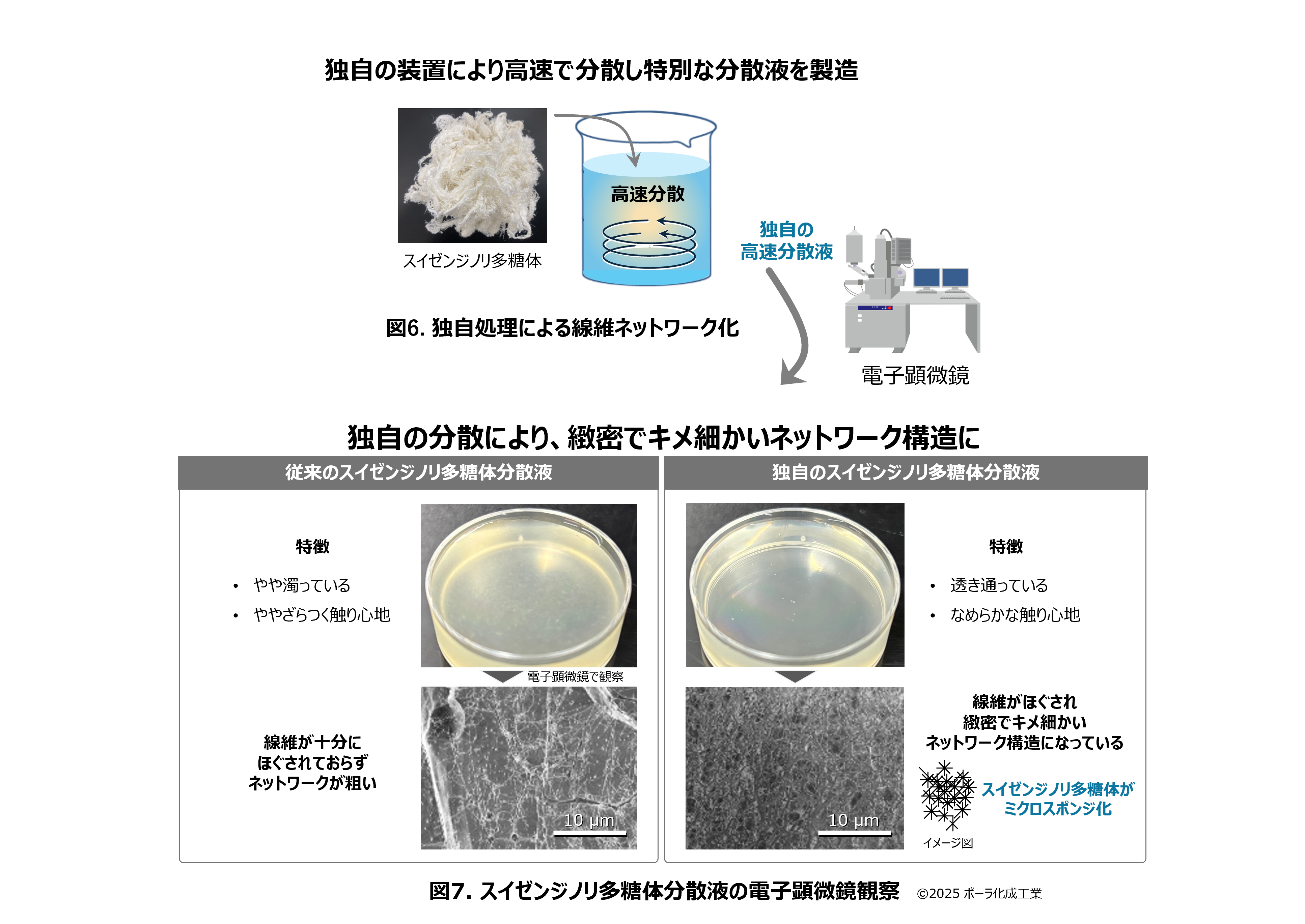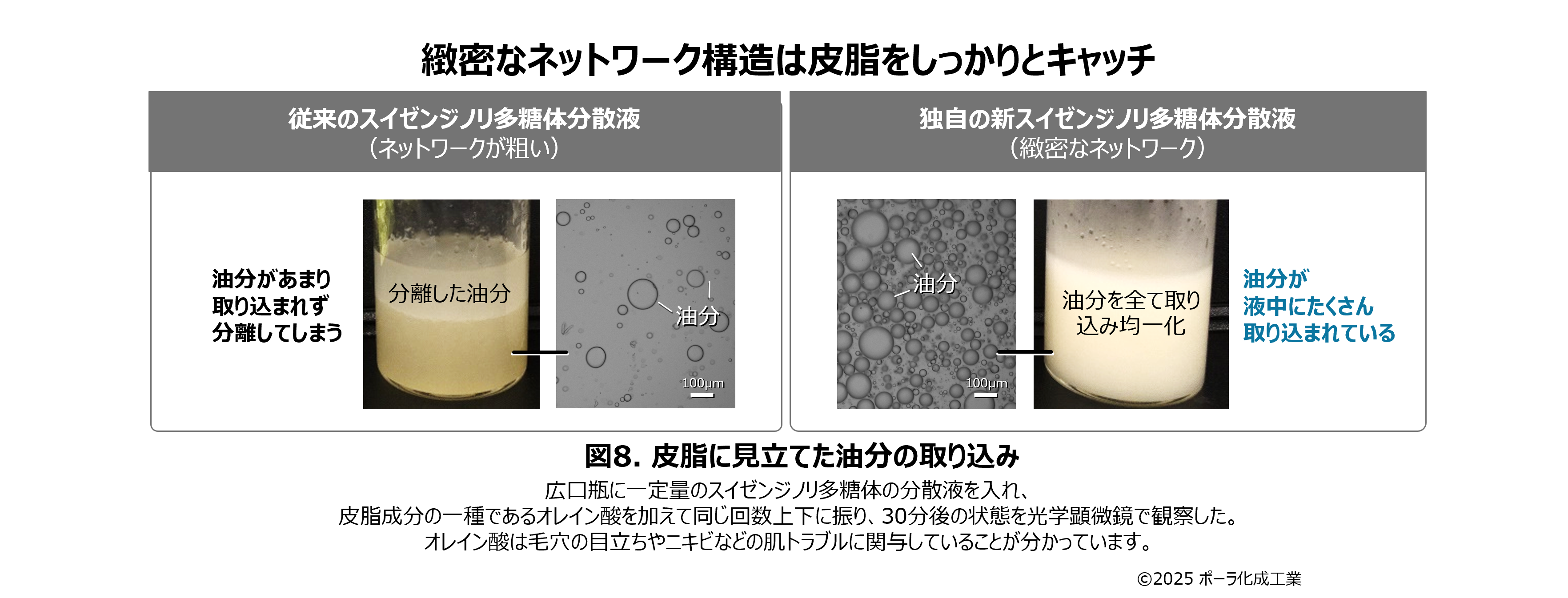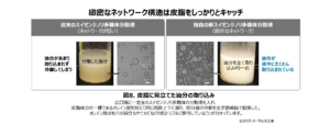 ポーラ化成工業では、TDCに導入した独自の高性能装置によりスイゼンジノリ多糖体を通常よりも高速で分散処理することで、水中の繊維ネットワークをより細かく緻密にすることに成功。これにより、皮脂に見立てた油分をしっかりキャッチすることができるようになった。スイゼンジノリ多糖体を水に溶かし、TDCに導入した独自の新装置により、超高速で分散処理を行った(図6)。電子顕微鏡で観察すると、従来の分散速度と比べて、微細で緻密な繊維ネットワーク構造に変化していることが確認された(図7)。皮脂に見立てた油分をキャッチする能力をテストした結果、独自の分散液では油分をたくさん抱え込むことが確認された(図8)。