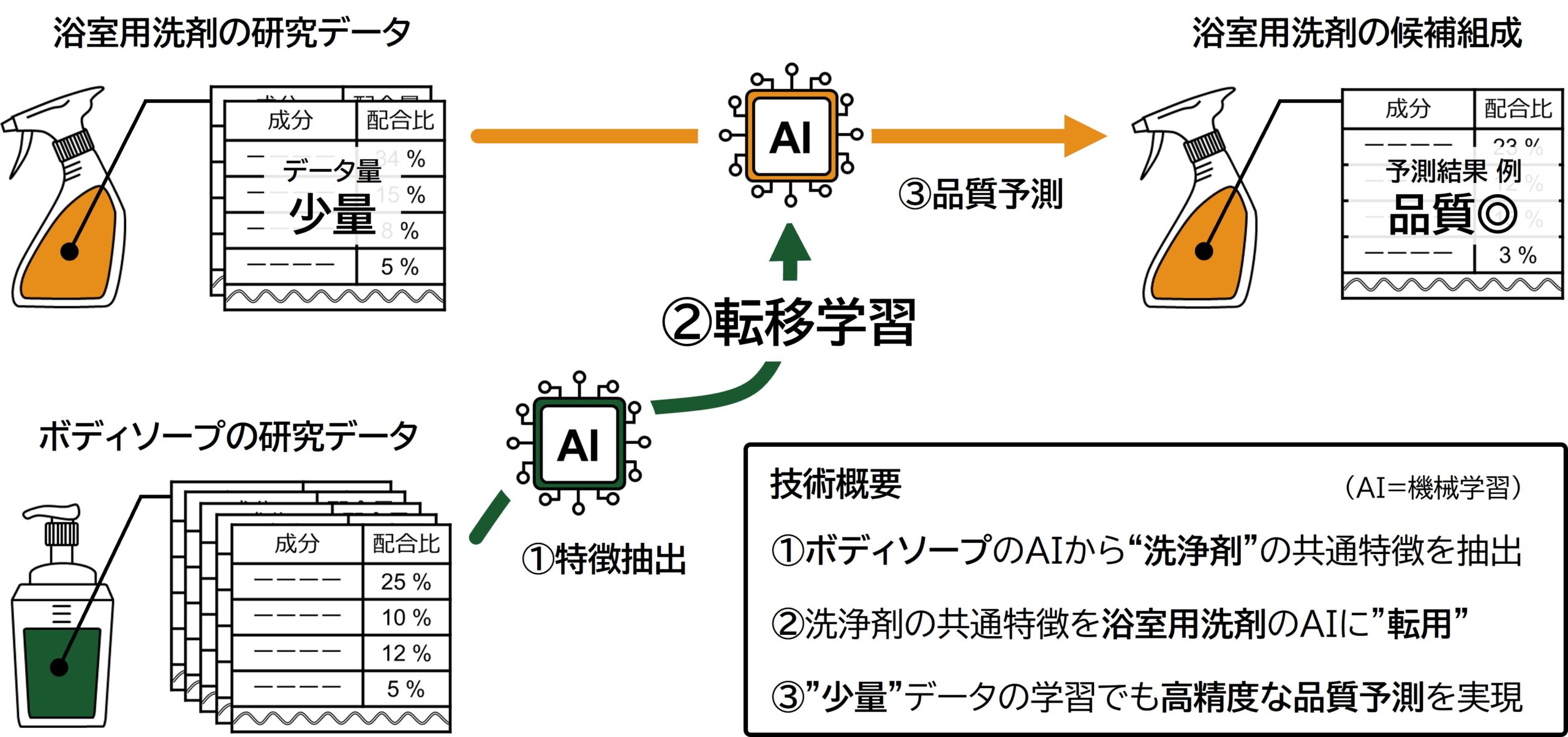 そこで今回、浴室用洗剤の開発において、同社で蓄積してきたボディソープの研究データを効果的に転用できるAI技術の開発に取り組んだ。