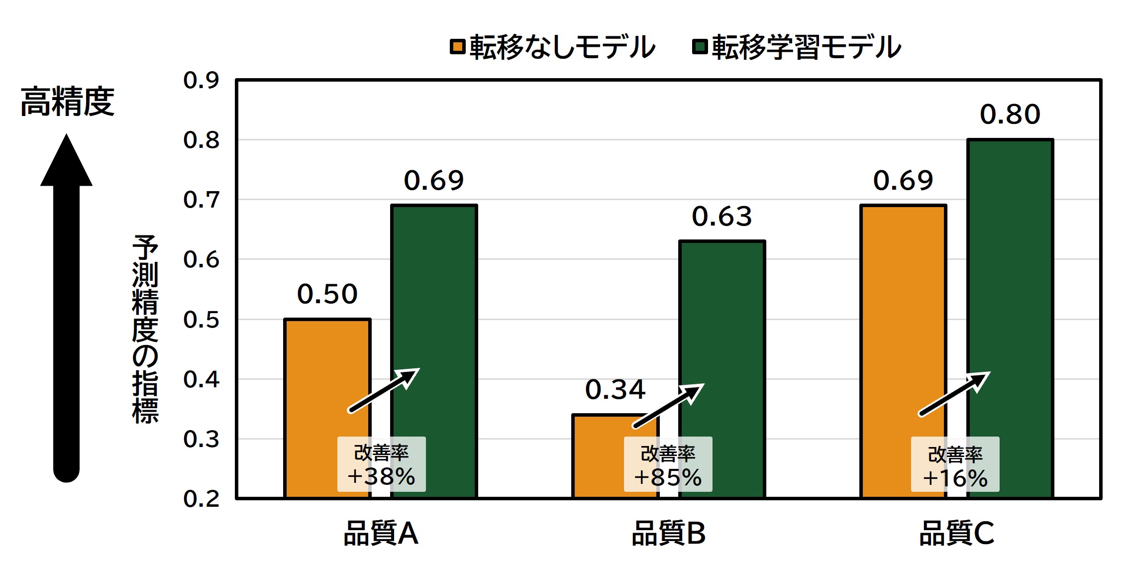 そこで同社は、独自開発した「特徴量生成の手法」を応用し、ボディソープの研究データから浴室用洗剤と共通する特徴を抽出した。「特徴量」とは、「機械学習モデル」の構築において、元のデータを加工・変換して分析や予測に有益な特徴を定量的に表現した数値のことである。抽出したこれらの特徴を浴室用洗剤の「機械学習モデル」に組み込み、品質予測に活用した。その結果、従来は困難であった異なる製品の研究データの転移学習が可能となり、少量のデータでも浴室用洗剤の品質を高精度に予測できる手法を確立した(図2)。
