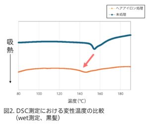 次に、DSC測定(示差走査熱量測定、基準物質と測定試料に一定の熱を与えながら、基準物質と試料の温度を測定して、試料の熱物性を温度差として捉え、試料の状態変化による吸熱反応や発熱反応を測定する手法。昇温速度10℃/minにて測定。図2,4の縦軸は、熱量)による、毛髪内部の構造が変化/崩壊する温度帯(変性温度)を確認したところ、ヘアアイロンを使用した毛髪では、変性温度が低下していることが分かった(図2)。このDSC測定における変性温度の低下は、毛髪内部の架橋密度が低下することを示唆している。
