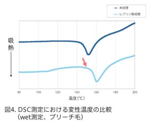 次に、レブリン酸を処理した毛髪と未処理の毛髪についてDSC測定を行った。その結果、レブリン酸を処理した毛髪では、変性温度が高くなることが確認できた(図4)。これは、レブリン酸が毛髪内部に浸透することで架橋密度が高まり、毛髪内部の組織間の接着性が向上し、熱に強い状態に変化したためと考えられる。