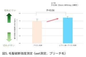 さらに、ブリーチ毛に対し、「ヘアアイロン処理」、「レブリン酸処理後にヘアアイロン処理」した毛髪の毛髪破断強度を比較した(図5)。「レブリン酸処理後にヘアアイロン処理」した毛髪は、「ヘアアイロン処理」した毛髪と比較して毛髪破断強度が上昇することが分かった。