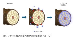 以上の結果から、レブリン酸はダメージのある毛髪内部に浸透して、内部構造の架橋密度を高めることで熱に強い状態に毛髪を変化させると考えられる。これにより、熱ダメージによる切れ毛を防ぐ効果が期待できる(図6)。