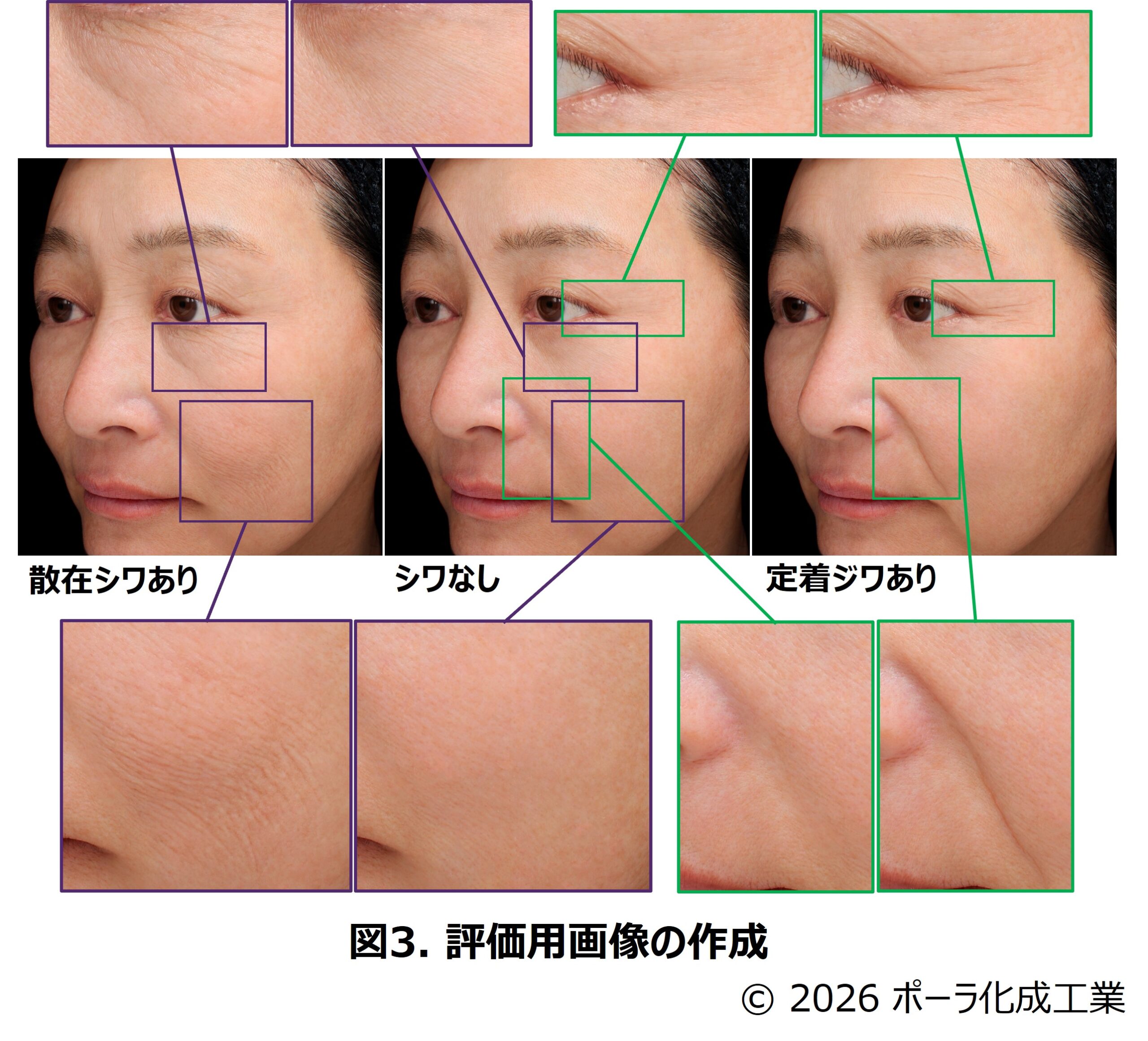 評価用画像は、数人の顔画像から架空の人物画像を“シワなし”画像として作成し、それをベースに散在シワを付与した“散在シワあり”、定着ジワを付与した”定着ジワあり”の画像を作成した(図3)。各シワには実在の人物より抽出したシワを使用した。シワ以外の影響を除外するため、シミや毛穴などのその他の肌の要素を除去した。