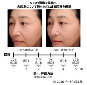 Webアンケートにて、パソコン画面上に“散在シワあり”と“シワなし”、または”定着ジワあり“と“シワなし”の画像をそれぞれ提示し、評価項目について、「左の画像の方がとても感じる」~「右の画像の方がとても感じる」の中から最も当てはまるものを一つ選んでもらった。各評価者の回答結果を、「シワあり画像の方がとても感じる(0点)」から「シワなし画像の方がとても感じる(5点)」までの6段階の点数にした(図4)。