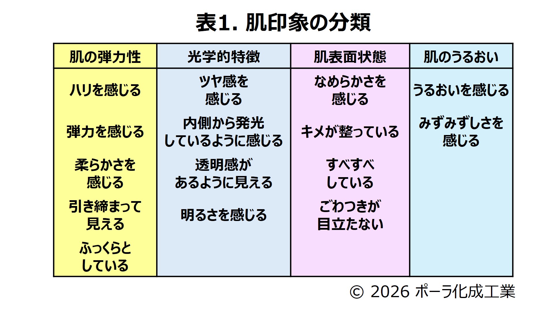 <肌印象>15種類の肌印象について質問した。回答結果を、「肌の弾力性」に関する5印象、「光学的特徴」に関する4印象、「肌表面状態」に関する4印象、「肌のうるおい」に関する2印象に分類し、それぞれの分類での平均点を求めた(表1)。