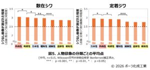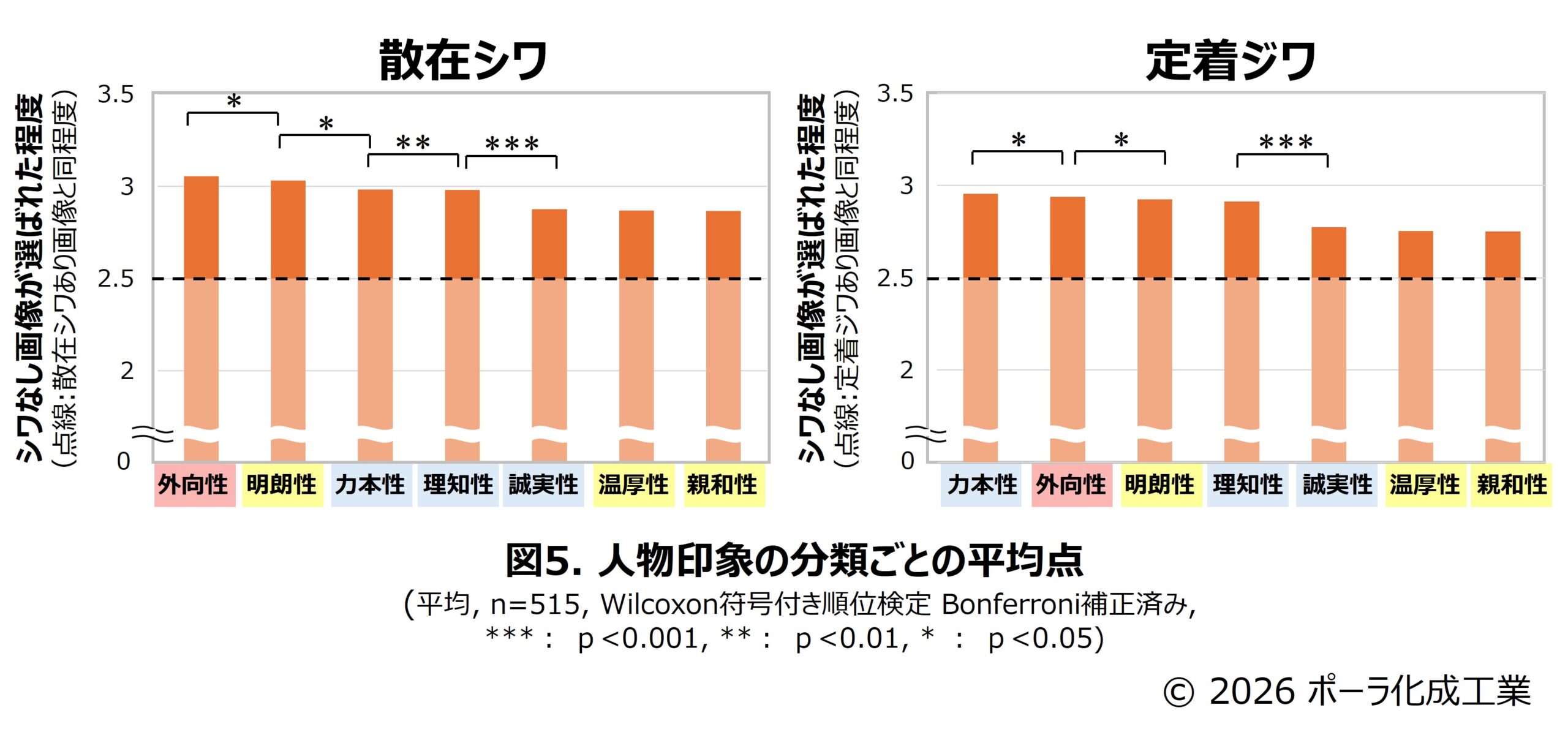 定着ジワあり顔とシワなし顔を同様に比較し、人物印象について、各評価者の平均点から全評価者の平均を求めた(図5)。点数が2.5より高いほど、シワなし画像が選ばれた程度が高いことを示す。シワなし顔の肌印象は、「ハリを感じる」などの「肌の弾力性」が最も多く選ばれ、肌の弾力性の印象に影響していた。散在シワありとシワなしの比較では、「外向性」が最も平均点が高い結果となった。一方で、定着ジワありとシワなしの比較では「力本性」が最も高い結果となった(図5)。
