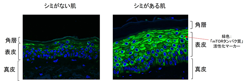 エピジェネティクス研究とは、同一の遺伝子を持つ一卵性双生児であっても、紫外線や生活習慣などの環境要因によって遺伝子の働き方が変化する点に着目した研究分野である。同社は約5年前からこの分野に取り組み、2021年には肌の明るさに関与する遺伝子「TIPARP」を特定してきたが、今回新たにシミの発生に関与する「mTOR(エムトア)タンパク質(※)」の特定に成功。従来、シミは表皮基底層に存在するメラノサイトでのメラニン過剰生成が主因と考えられてきたが、後天的な変化によって表皮内の「mTORタンパク質」が過剰に活性化することが、より早い段階でのシミ発生に関与している可能性を示した。