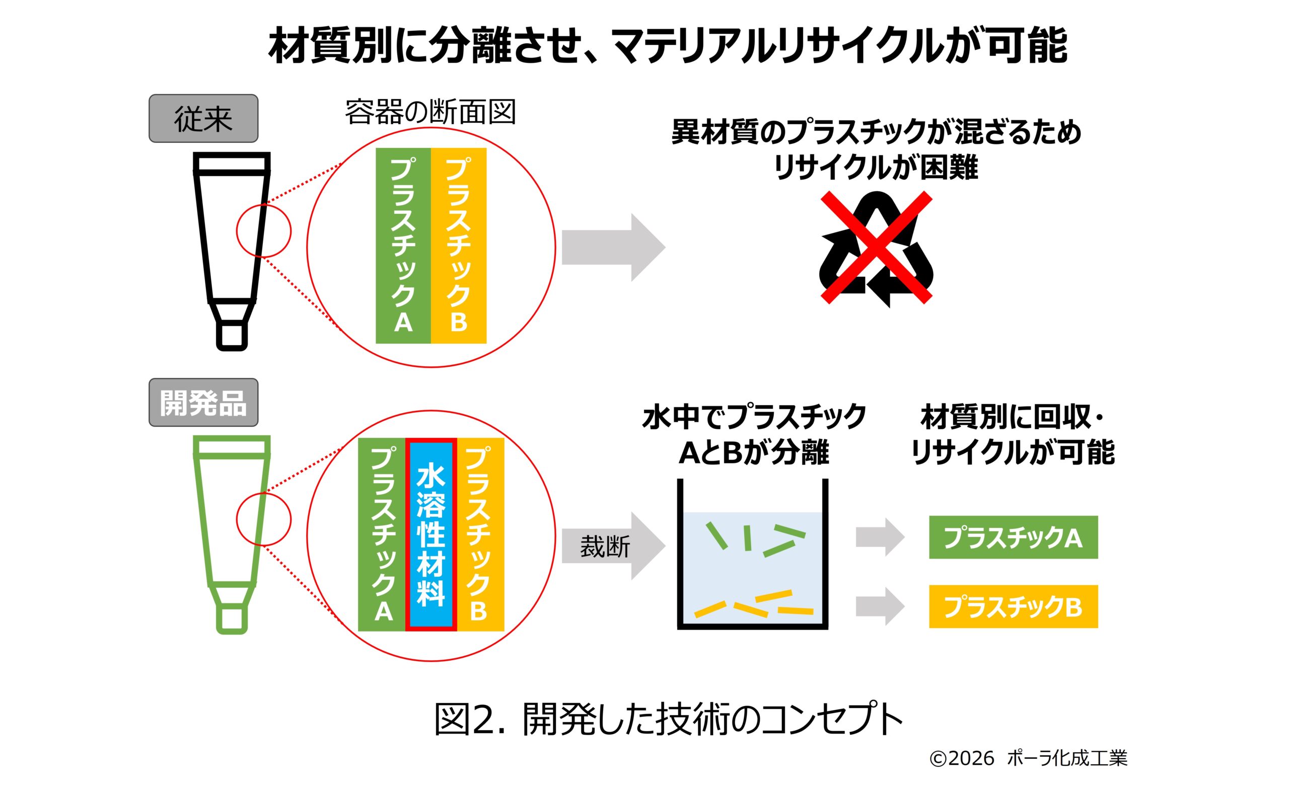 ポーラ・オルビスグループの研究・開発・生産を担うポーラ化成工業は、異なるプラスチック材質を分離する容器技術を開発した。三菱ケミカルが製造する、水に溶ける特殊材料(ニチゴーGポリマーTM;ビニルアルコール系樹脂)を中間層に用いることで、使用済み容器を水に浸して攪拌するだけで材質ごとに分離できるという画期的なものだ(図1)。これにより、高品質なリサイクル材の回収と再利用を実現し、従来困難だった積層構造容器のマテリアルリサイクルが可能となる。