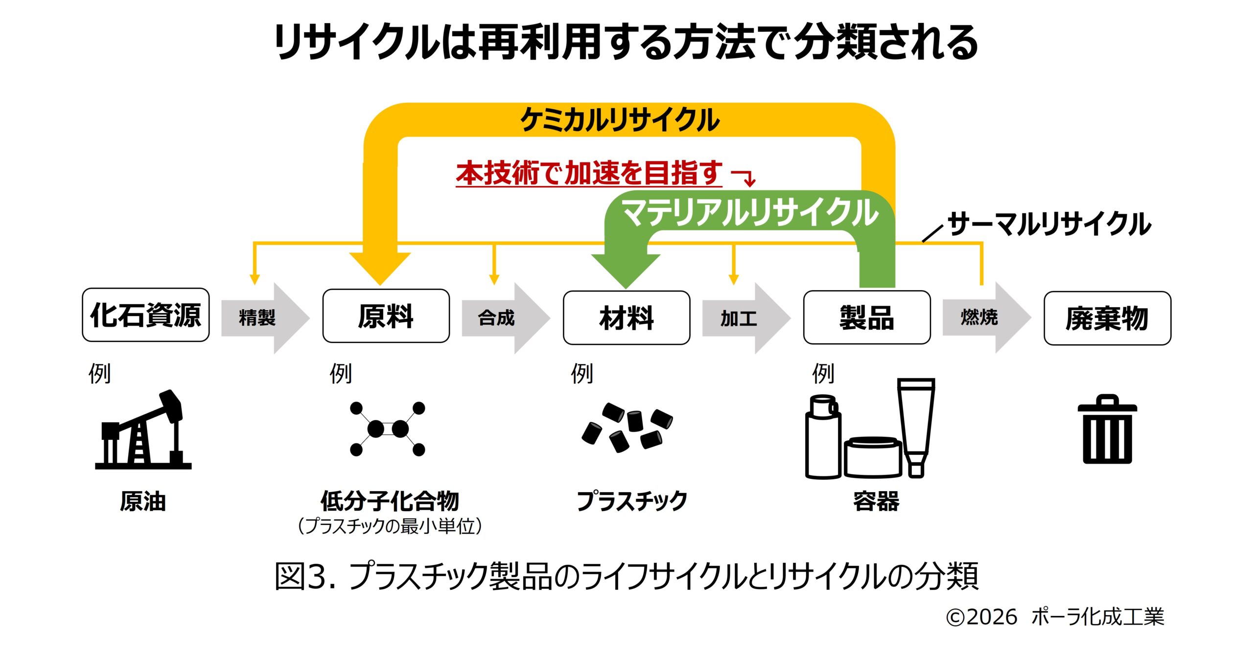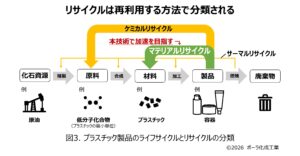 マテリアルリサイクルとは、処理方法に応じて「サーマルリサイクル」「ケミカルリサイクル」「マテリアルリサイクル」の三つに分類されるうちの一つ。(図3)