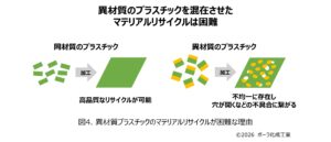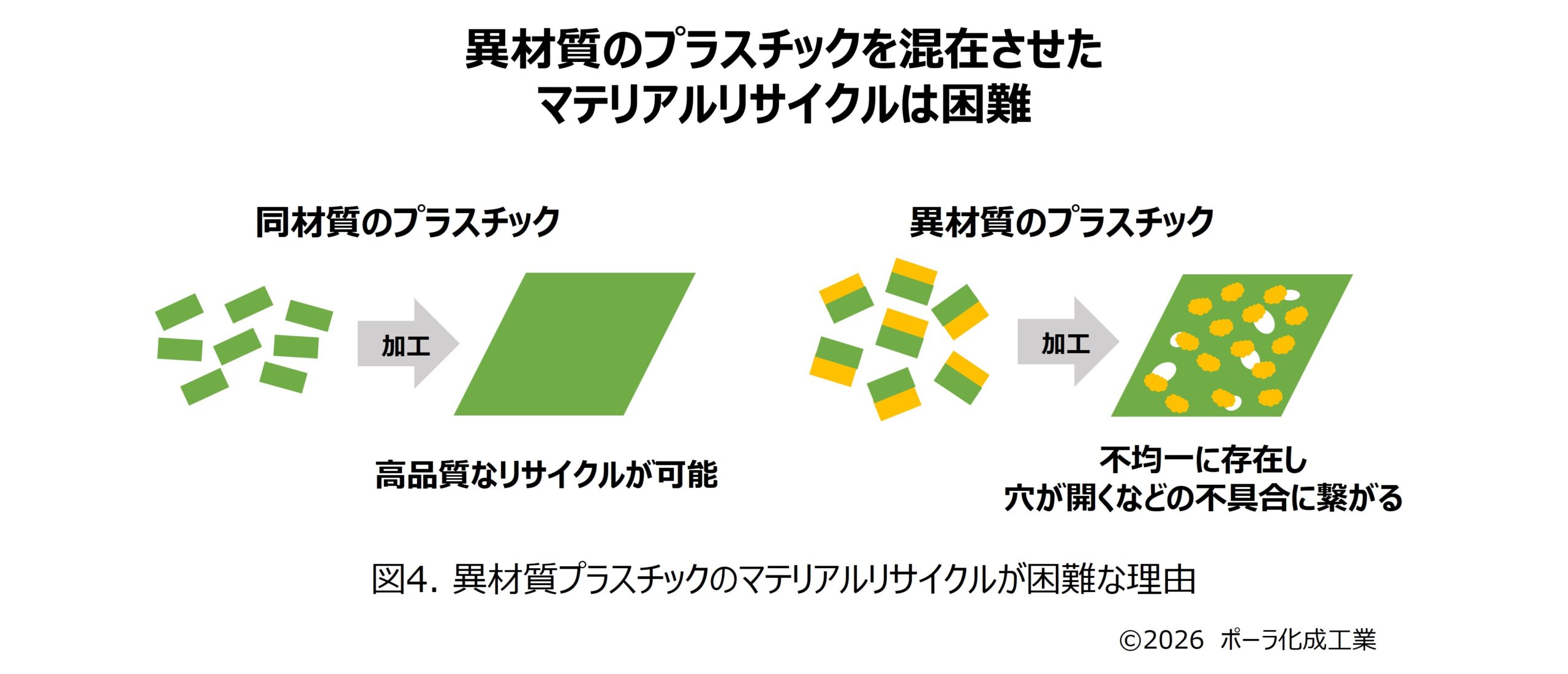 化粧品容器を分離せずにマテリアルリサイクルに用いると、材質の異なるプラスチックは均一に混ざり合いにくいため、品質が著しく低下してしまう(図4)。積層構造の容器は異なるプラスチック層同士を強固に接着する必要があるため、材質ごとの分離が困難で、結果として同じ製品へのリサイクルができない/用途が限定されることが課題となっていた。