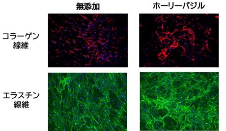 また、低酸素環境の皮膚細胞にホーリーバジルを添加すると、肌のハリを保つコラーゲン線維・エラスチン線維の両方が増加することが分かった。