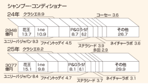 プレミアム価格帯(1400円以上)の勝者が市場を制する構図は変わっていない。マス戦略一辺倒だった花王は2024年にヘアケア事業変革に着手。「THE ANSWER(ジアンサー)」「melt(メルト)」など高付加価値ブランドがヒットし、市場拡大をけん引する存在に躍り出た。25年もI-neやヴィークレアなど上位各社が軒並みシェアを落とす中、花王は1.4ポイント伸長。競争市場は事実上、花王の独壇場となった。