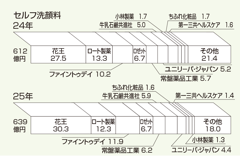 高機能プレミアム競争で存在感を強めたのが花王である。化粧水、乳液、美容液、栄養クリーム、洗顔料の5カテゴリーにおいて売上高が2桁伸長。市場成長率を上回るペースでシェアを伸ばした。マス市場におけるプレミアム化が進む中、機能価値を明確に打ち出す戦略が奏功している。