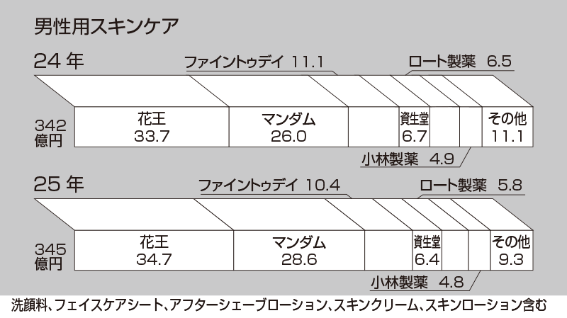 スキンケアでは花王が前年から1.0ポイント伸長の34.7%で首位を維持した。けん引役は「メンズビオレ」。高機能洗顔料「THE FACE」が洗浄力や肌悩みに応じた処方設計を明確に打ち出し、従来の「安価で手軽」という価値から一歩踏み込んだ機能提案を行ったことが支持を集めた。THE FACEは男性用洗顔料内で13.5%のシェアを獲得し、メンズビオレ洗顔計売り上げは前年比115%と大きく伸ばした。
