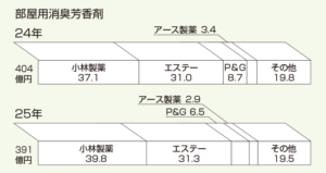 コロナをきっかけに消臭芳香剤市場は、自宅時間の充実需要を追い風に拡大してきた。しかし2025年は、部屋用は縮小の一方、トイレ用は拡大。消臭芳香剤の基本機能の不快臭対策や香り需要だけでは満足せず、消費者はその先の空間演出を求め始めていることが明確となった。この変化に先手を打ったエステーと小林製薬が、市場縮小傾向下でもシェアを伸ばした。