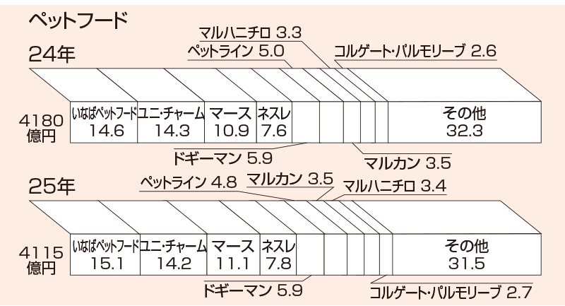 有望市場と言われ続けたペット市場だが、2025年は踊り場を迎えた。市場の大部分を占めるペットフードは前年比98.4%の4115億円と縮小。踊り場の背景の一つに、これまで売り上げを押し上げてきた価格改定の一巡がある。原材料高騰を起点に日用品全体へ広がった値上げの波はペットカテゴリーにもおよび、市場規模拡大を支えてきたが、その効果は薄れつつある。