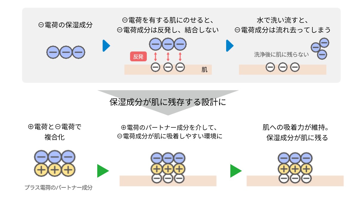 シロキクラゲ多糖体は、保湿成分として既にさまざまなスキンケア商品で活用されているが、洗顔料に配合すると、肌と同じマイナスの電荷を持つ特性から肌と反発を起こし、洗顔料中にある保湿成分が洗浄後に留まりにくいという特性があった。そこで、マイナスの電荷を持つ保湿成分にプラスの電荷を有する他の成分と組み合わせることで、電気的反発を抑制し、洗浄後の肌に保湿成分を留める設計を作り出した。