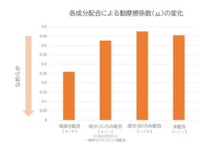 次に肌表面のなめらかさを確認するため、摩擦係数を評価した。20℃の環境下で人工皮革シートを装着し、研究品を塗布した5分後に評価を行った。(A)はコメ発酵成分、(B)はエステル油だ。未配合やそれぞれの成分のみを配合した処方よりも両成分を配合した処方の方が、約半分の摩擦係数になっていることがわかった。この結果から、両成分を配合した新処方は肌表面のなめらかさを実現しながら、保湿感も持続することがわかった。
