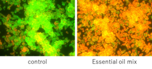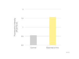 試験方法:黄色ブドウ球菌を一晩培養してバイオフィルムを形成させ、ブレンド精油添加によるバイオフィルム内の細菌の生死を蛍光顕微鏡で観察した。緑色は生細胞、橙色は死細胞を示す。蛍光強度比をブレンド精油添加ありなしで比較した。(出典:THREEホリスティックリサーチセンター調べ)
