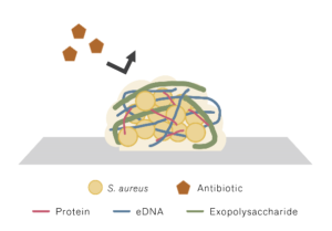 バイオフィルムとは、微生物やそれらが産生する物質(主に菌体外多糖類、たんぱく質やDNAなど)が集合して出来た構造体を指す。バイオフィルムは、粘着性が非常に高く抗菌剤や免疫細胞といった外的要因から細菌を守るためのバリアとして機能しており、簡単に洗い流すことが難しく、また抗菌剤や殺菌剤が浸透しにくいという特徴がある。