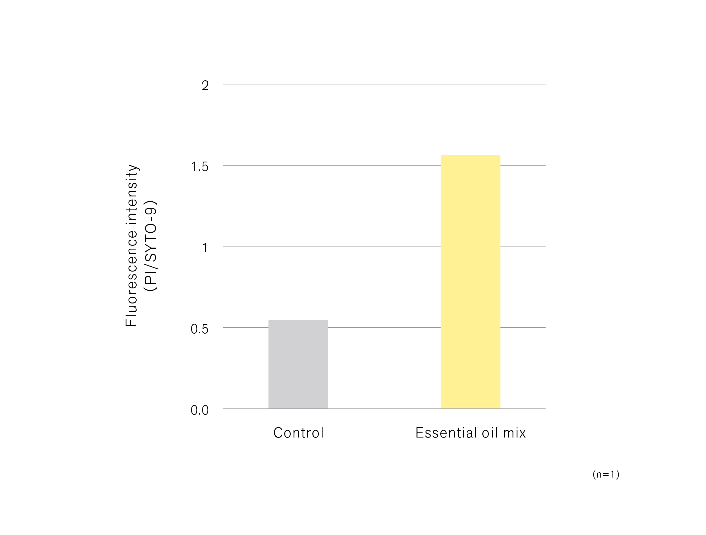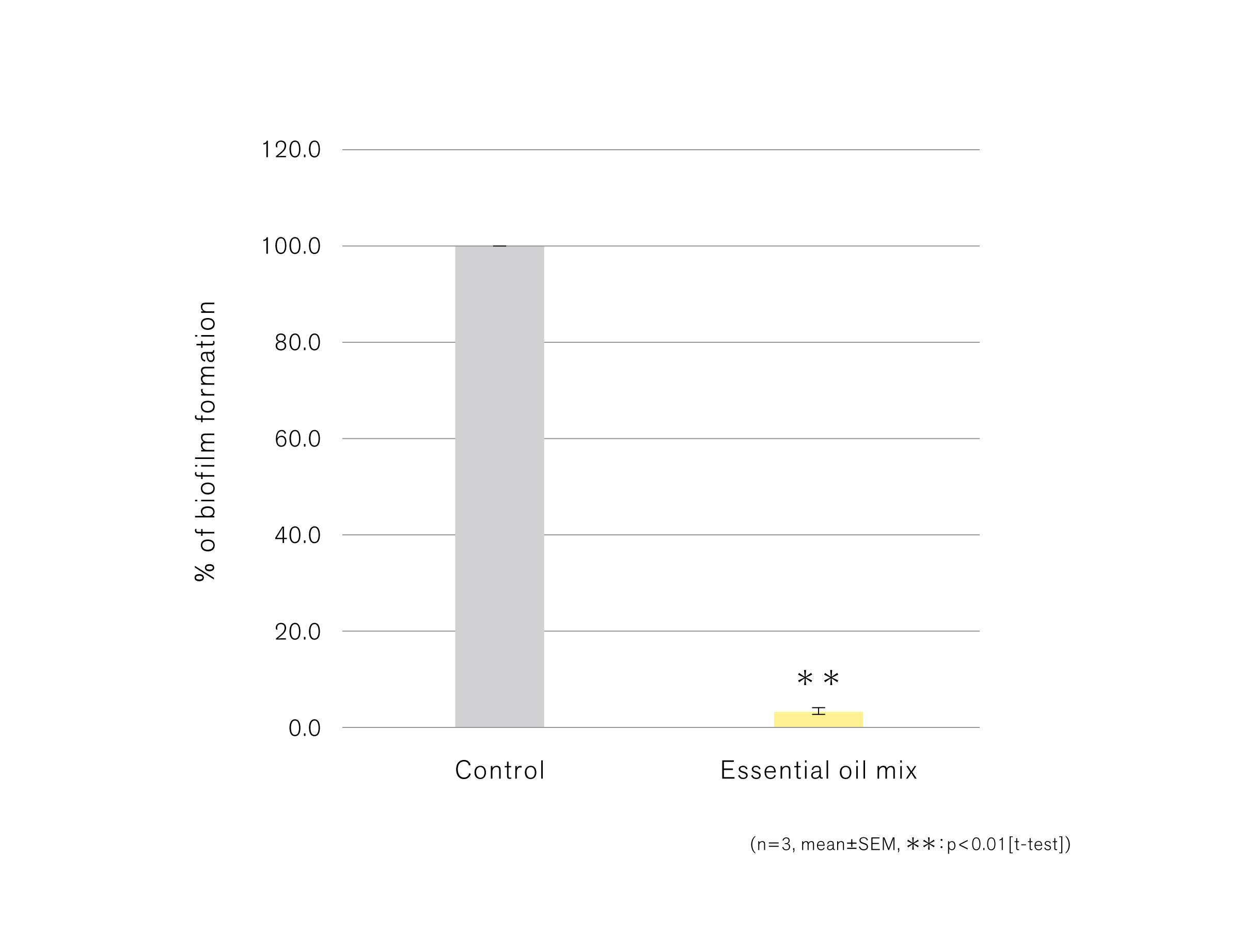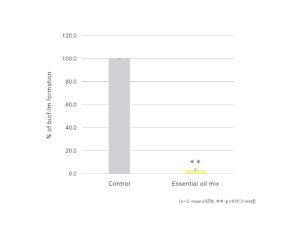 シナモン、クローブ、オレガノの精油を配合したブレンド精油を用い、黄色ブドウ球菌に対する効果を検証した。バイオフィルム形成阻害能を評価するため、黄色ブドウ球菌培養時にブレンド精油を添加したところ、バイオフィルムの形成量が有意に低下することが確認された(図1)。