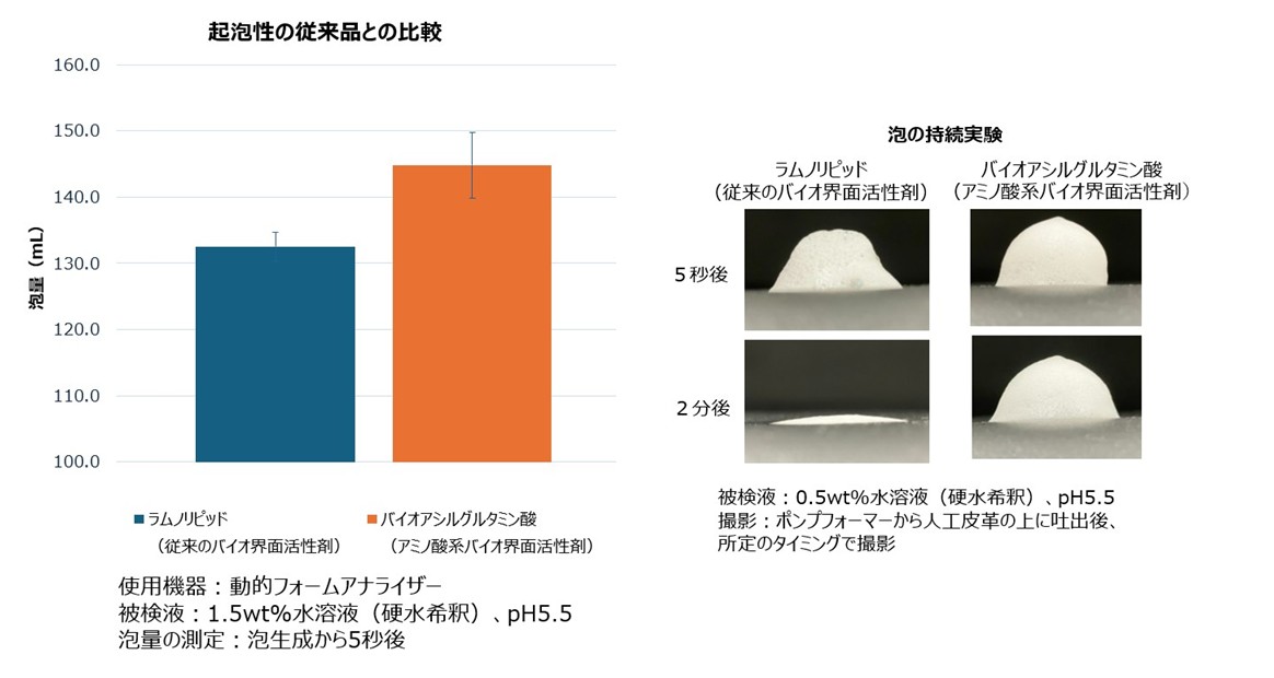 味の素は、従来パーム油由来の脂肪酸を原料とするアミノ酸系界面活性剤の製造において、世界各地で安定的に調達可能な糖のみを原料とする、発酵技術を用いた新製法を開発した(特許出願中)。同技術により、石油由来原料のみならず、パーム油も使用しないアミノ酸系バイオ界面活性剤(微生物が作る界面活性剤、「バイオアシルグルタミン酸」を指す)の提供が可能となる。この技術を活用することで、従来のバイオ界面活性剤で課題とされていた色やにおいの問題を解決し、より高い泡立ちを実現した。