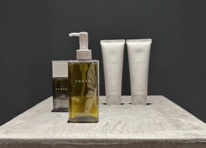 ラインアップの一つで、中核となる「THREE バランシング クリア クレンジング オイル」(185㍉㍑・5060円、レフィル180㍉㍑・4620円)は、自然由来指数93%・美容液成分91%の処方とし、植物オイルとスパイス精油を組み合わせた独自処方を採用。「溶かす・浮かせる・包み込む」の3段階でバイオフィルムを除去する。「同 ポイントメイクアップ リムーバー」(90㍉㍑・4180円)は、自然由来指数90%。ローズマリー精油と芳香蒸留水の2層式リムーバーで、メイクオフとトリートメントを同時にかなえる。