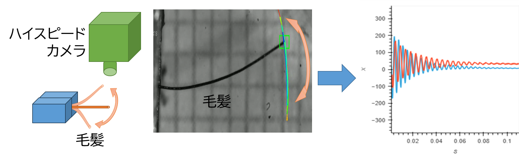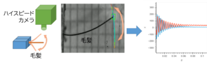 人が他人の毛髪を見て美しいと感じるときには、必ず動いている時間の中で判断をしている。そこで同研究では、毛髪が揺れる様子をハイスピードカメラで撮影し、時間軸に沿った動きを数値化する独自技術を開発した(図2)。