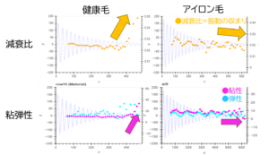解析の結果、健康でしなやかな髪は、揺れが収まる際に素早く動いた後、ピタッと静止する(減衰比が増加する)のに対し、アイロンダメージを受けた髪は、いつまでもふらふらと揺れ続け、収まりが悪い(減衰比が上がらない)ことが判明した。