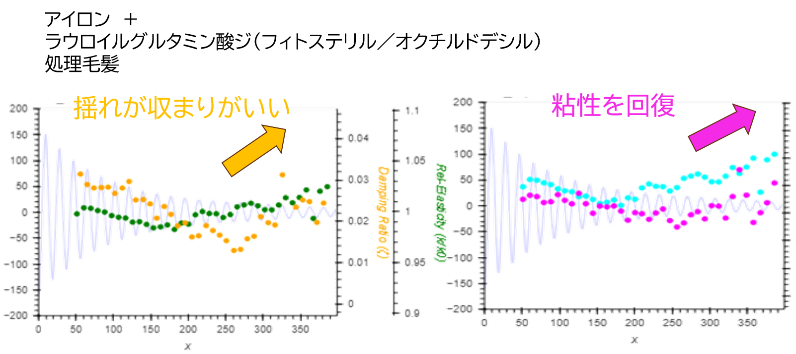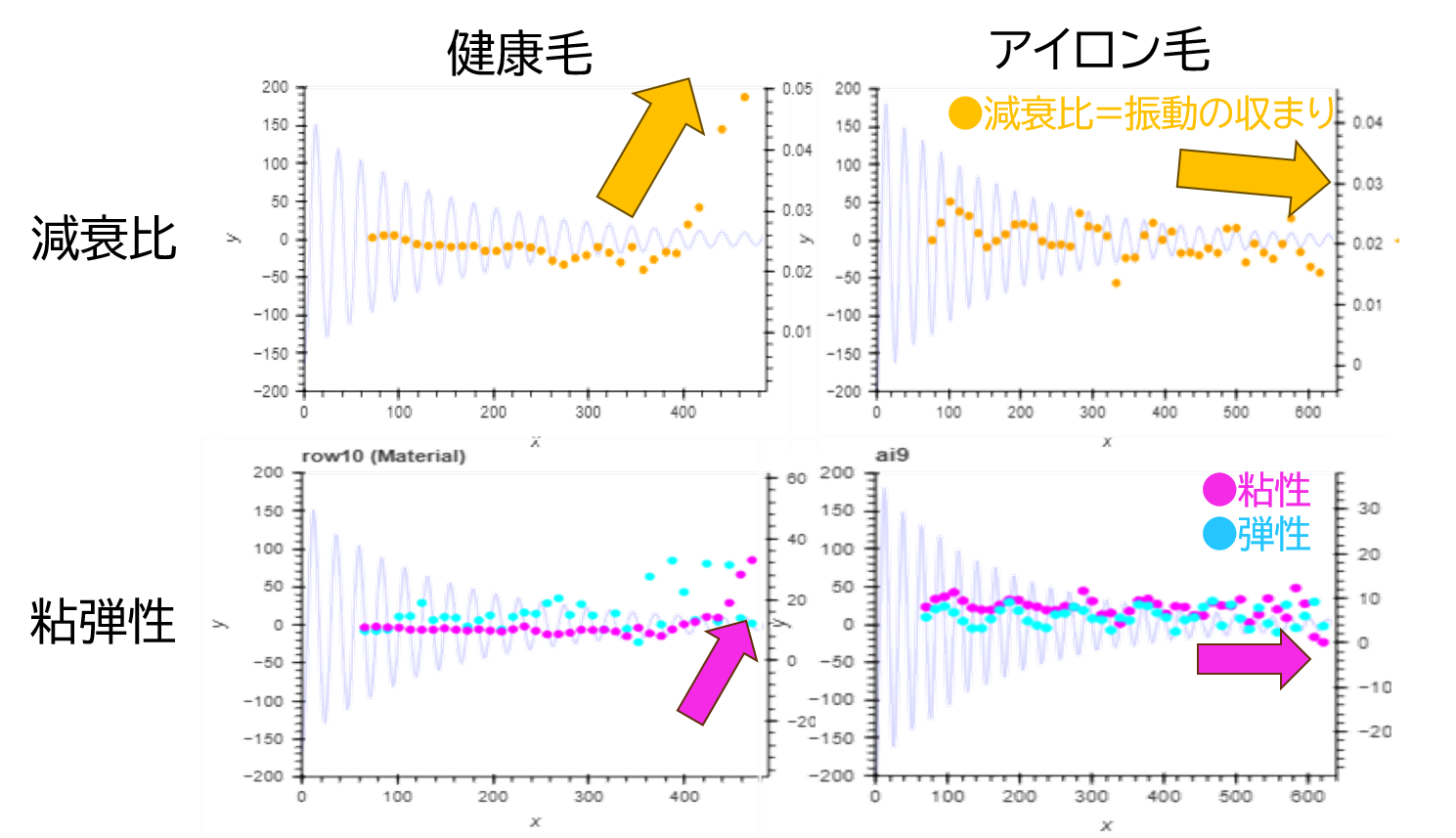 さらに、振動をより詳細に解析し要因を追究したところ、アイロンダメージ毛では「揺れの最後に振動をピタッと収めるための粘性成分」が減少していることが明らかになった(図3)。