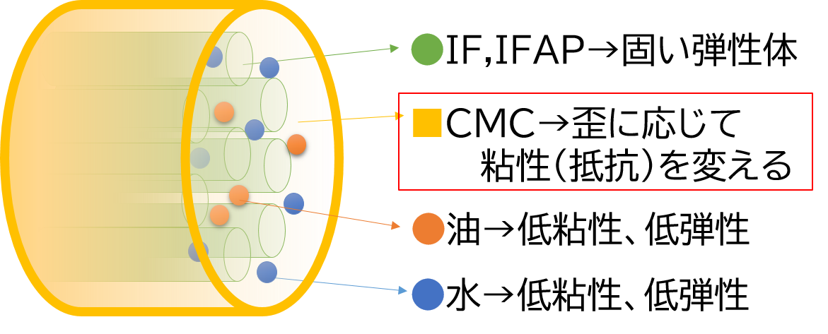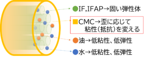 「揺れの最後に振動を収める」成分とは、振幅(歪み)が小さくなるにつれて粘性が増加する性質を持つものだ。この挙動の鍵を握るのが、毛髪の細胞間をつなぎとめる接着剤である「CMC(Cell Membrane Complex:細胞膜複合体)」だ(図4)。