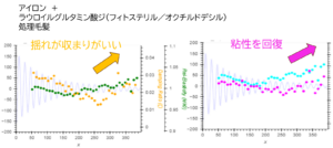 ラウロイルグルタミン酸ジ(フィトステリル/オクチルドデシル)は、これまでも髪のしっとり感やコーミングによる髪のひっぱりによるダメージにアプローチする成分として使用されてきた。揺れの最後に振動を収める機能が今回新発見となった。