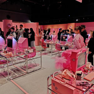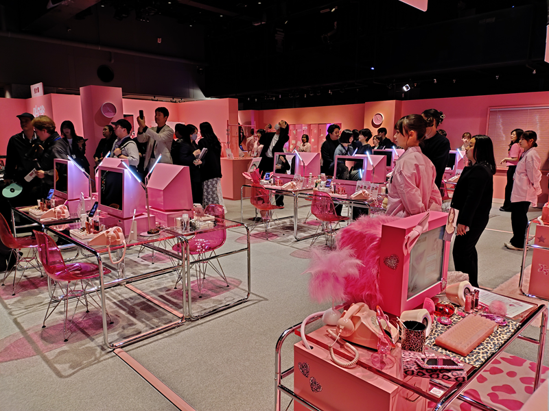 ポップアップイベントは、架空の企業〝ロムアンド商事〟のオフィスをモチーフとした2000年代風のピンクの空間を構築。アイドル課、女優課、ギャル課の三つのテーマでドレスコードを設け、来場者にいずれかをイメージした装いで来場してもらい、ロムアンド商事の社員になりきって、リップオイルの秘密を探る体験型コンテンツを通じ、ブランドの世界観と新商品を体感してもらった。