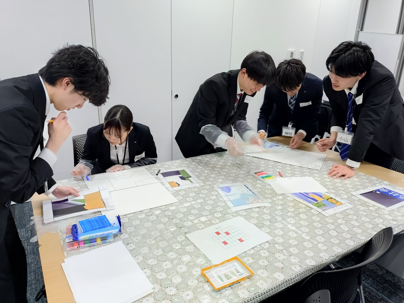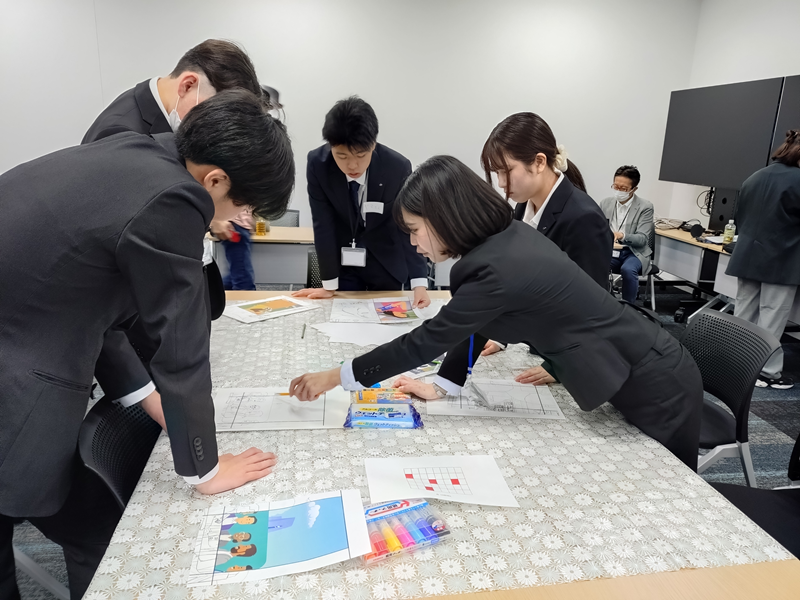 今回初開催となる「The Big Picture」は、パーパスの理解浸透とともにチームビルディングの一端を体験してもらうもの。参加した52人の新入社員が10チームに分かれてチーム内での議論とともに、他のチームと連携しながら、パーパスを表現する1枚の絵を作り上げた。