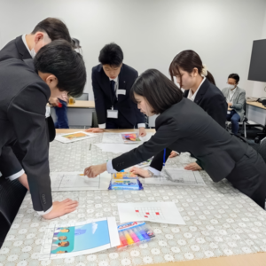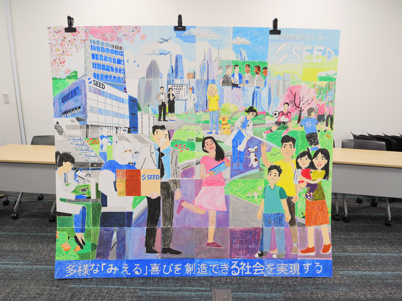 参加した新入社員は、「初めはキャンバスが白くて完成するか不安でしたが、全チームと協力して一つの絵ができて感動しました。シードの仕事も『みえる』をサポートすることであり、絵の中で『みえる』を喜んでいる人がたくさんいるように、同期や先輩と協力して、世界に『みえる』喜びを広めていきたいと感じました」「人種、動物、職業など、関係なくシードがつくるコンタクトレンズが、皆の『みえる』を支えていて、笑顔をつくっていることが伝わってきました。絵の中の一つでも欠けてしまうと、『みえる』喜びは提供、受け取ることができないため、皆が必要な存在だと感じました」「シードのコンタクトレンズには色々なお客様が関わっていることを改めて感じました。また、コンタクトレンズが世の中に出る流れが1枚の絵になっていて、これから働く上でのモチベーションになった。みんなでこの絵を完成させることができ、同期のつながりが強くなったと思う。良い経験になりました」と、今回の体験を通じて今後の社会人生活に向けて気持ちを新たにした。