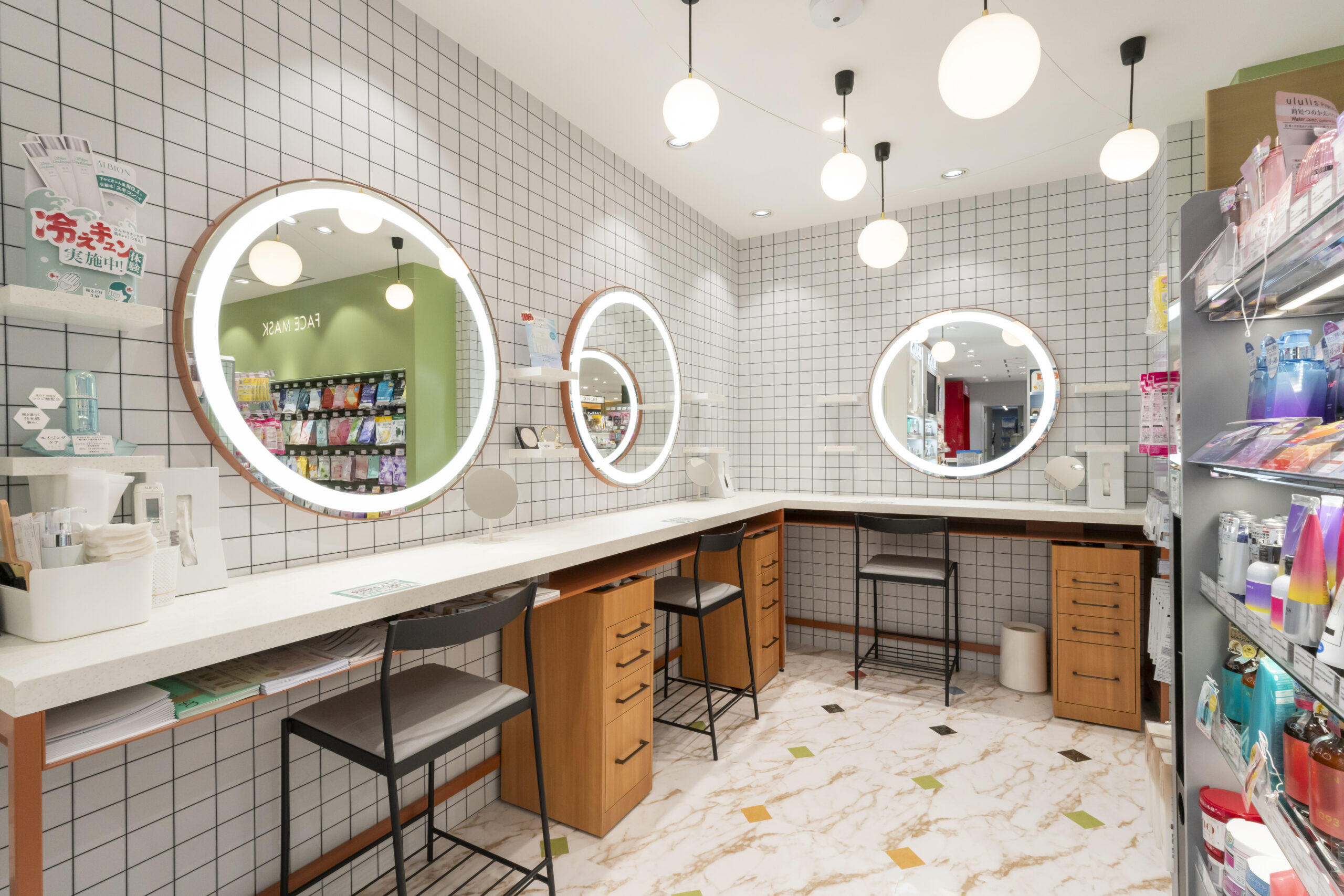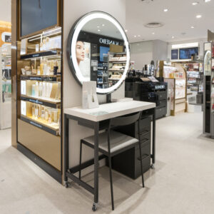 カウンセリングスペースは店内10カ所に点在し、アットコスメの美容部員が5人常駐。アットコスメに来店するお客は、いろいろなメーカーを比較しながら自分に合うものを探したいと考えている人が多い。そこで美容部員は一つのブランドだけでなく、価格帯の違う複数のブランドから、少なくとも3商品紹介することを意識して接客を行う。多品種多品目を取りそろえるアットコスメならではのブランド横断型の接客を生かす。接客スペースでの丁寧なタッチアップのほか、店内をガイド付きで見て回れるなど、お客の都合に合わせて、さまざまな形で美容部員の接客が受けられるのも強みの一つだ。