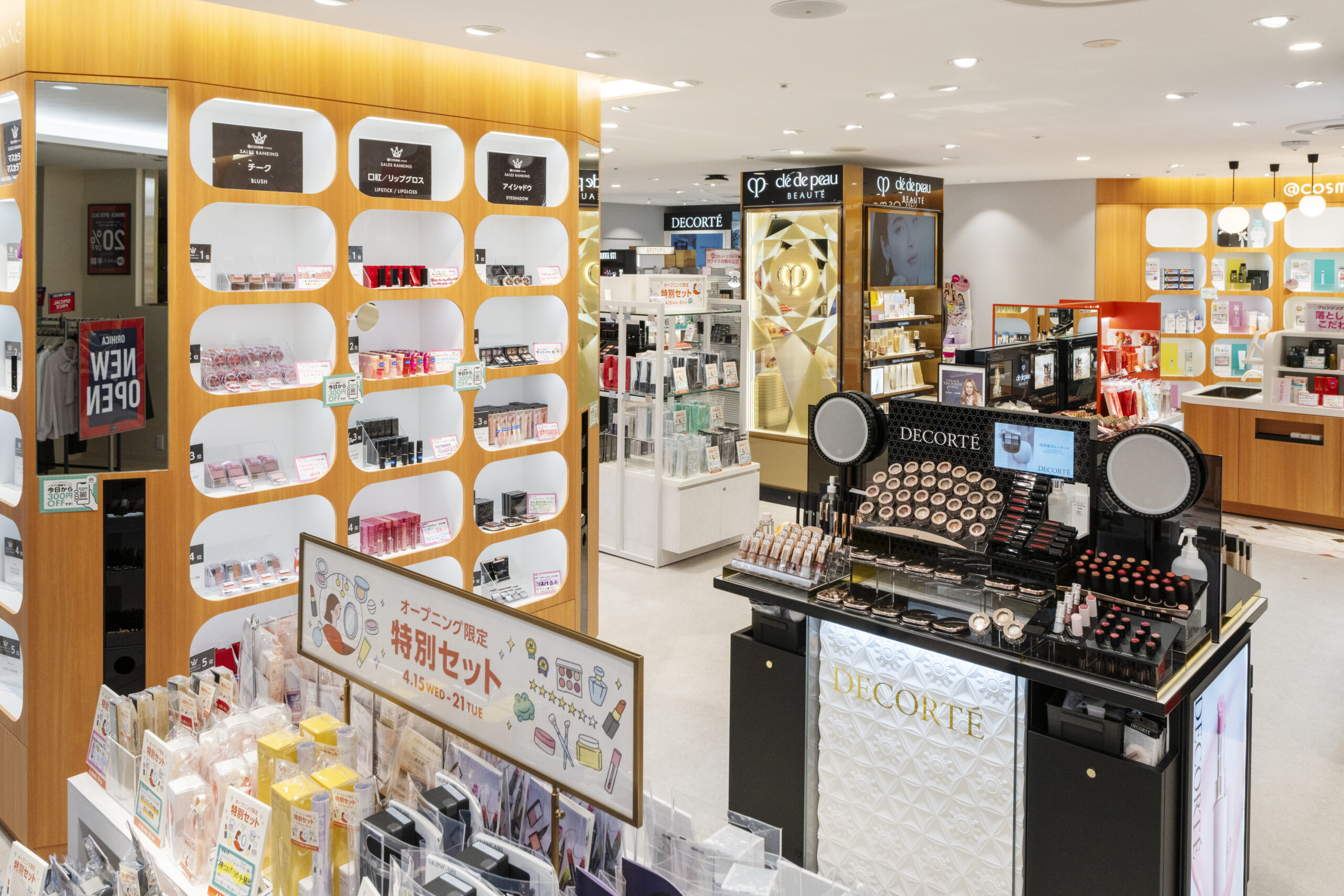 新装開店に伴い、オープニングキャンペーンとして、4月15日~21日まで、①店内全品10%ポイントバック②税込3300円以上購入でサンプルセットプレゼント③人気ブランド特別セットオープン限定販売④ハズレなし、ガラポン抽選会(4月15日~17日限定)⑤錦糸町店限定ショッパープレゼントの五つを行った。