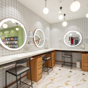 移転前、シドニーは、高いカウンセリング力で主に30代~50代の支持を集め、開店から30年にわたり地域で愛されてきた。新店舗に様変わりするにあたり、従来のアットコスメストアの意匠にシドニーのテーマカラーであるオレンジやロゴカラーを散りばめたレトロモダンなデザインを融合。既存顧客も新規顧客も高揚感と心地よさを味わえる、錦糸町の日常に溶け込む空間に仕上がった。