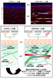 研究により、①血管内皮細胞の導入による、真皮間葉系細胞の多様性を再現した人工皮膚の構築②血管内皮細胞の導入による、皮膚バリア機能と真皮弾力性の改善③ビタミンCのターンオーバー改善、肌弾力改善作用は、血管付属人工皮膚で増強される――の三つの結果が得られた。