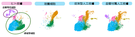 一般的な人工皮膚は、表皮角化細胞と真皮線維芽細胞の2種の細胞からなる、表皮と真皮の2層モデルだ。まず研究チームは、表皮角化細胞、真皮線維芽細胞、臍帯由来血管内皮細胞の3種の細胞を用いて血管構造を持つ人工皮膚モデルを構築した(図1)。次に、構築した人工皮膚に含まれる細胞を対象に単一細胞RNAシークエンス解析を実施し、真皮に含まれる細胞の性質と多様性を評価した。生体ヒト皮膚の真皮には多様性のある線維芽細胞と血管周皮細胞が含まれるが、研究用にこれらの細胞を平面培養した細胞では多様性が喪失されていた。その一方で、構築された人工皮膚の線維芽細胞と血管周皮細胞の多様性分布パターンが生体ヒト皮膚と非常に類似したパターンであることが確認された(図2)。この結果は、従来困難とされていた線維芽細胞と血管周皮細胞の細胞不均一性の再現には、三次元環境と血管と皮膚の細胞間相互作用が重要な役割を果たすことを示している。