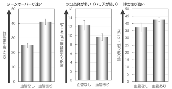 次に、血管の有無による人工皮膚の機能性を比較した。その結果、肌の保湿バリア機能、透明感などに重要な役割を果たすターンオーバー機能、しわたるみに関わる肌の弾力性について、血管付与による改善が認められた(図3)。