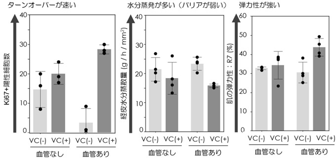 さらに、血管の有無による人工皮膚のビタミンCに対する反応性を比較した。その結果、肌の保湿バリア機能、透明感等に重要な役割を果たすターンオーバー機能、しわたるみに関わる肌の弾力性について、血管付与によってビタミンCの有用性が増強されることが確認された(図4)。