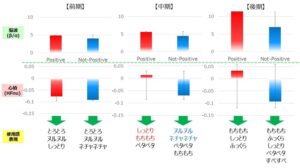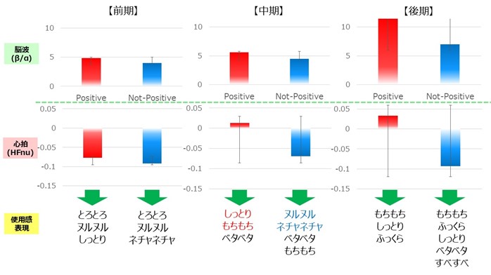 塗布時間を感触の変化(図2)に合わせて分割した結果、前期では差が見られない一方で、使い心地に変化を感じる中期以降において、Positive群では副交感神経活動の指標となるHFnuが正の値に上昇し、快方向に移行する傾向が見られた(図3)。また、そのときに感じる使い心地について、Positive群では「しっとり」「もちもち」と表現されるのに対し、Not-Positive群では「ヌルヌル」「ネチャネチャ」と、異なる表現をされることが確認された。一方、肌の仕上がり感を感じる後期では、引き続きPositive群のHFnuは快方向、Not-Positive群は不快方向のままだったが、使い心地は両群ともに「もちもち」「しっとり」「ふっくら」といった同じ表現型となった。
