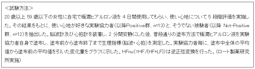 極潤ヒアルロン液の使用時において、事前に「好み」に基づき分類した群間で、塗布時間全体の生理指標に違いは見られなかった。(図1)