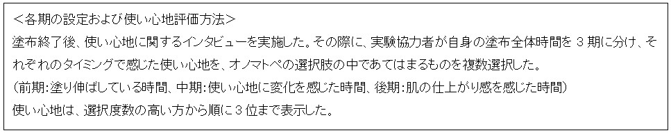 同社ではこれまで、生理指標を用いた感性評価(製品使用時に人が感じる印象や心地よさなどの主観的感覚を評価すること)により「好ましさ」による反応の違いを明らかにしてきたが、その違いが、塗布中のどの場面で生じ、どのような使い心地と結びついているのか、その表現型までは明らかではなかった。そこで同研究では、塗布中の使い心地の変化に着目し、生理指標を組み合わせて解析することで、感性の違いの詳細な解明を目指した。