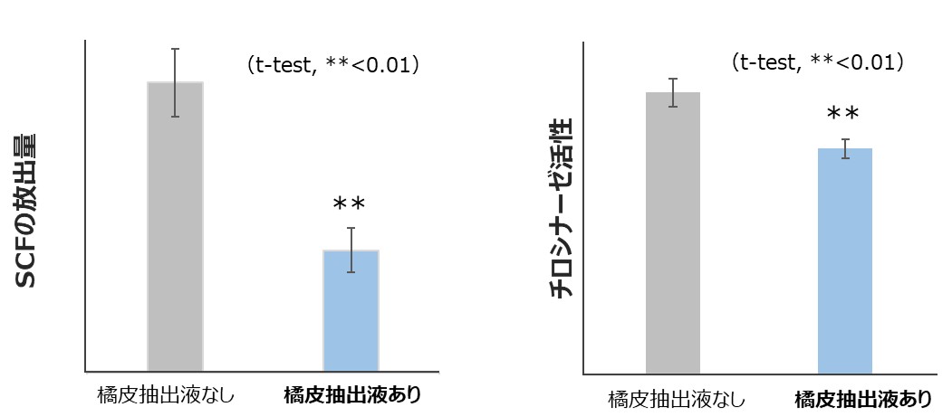 以上の結果から、「橘皮抽出液」には、表皮細胞からのSCF放出を減少させてメラノサイトの活性化を抑制する作用と、PAR2の産生を抑えて表皮細胞のメラニン取り込みを防ぐ作用があることを見いだした。