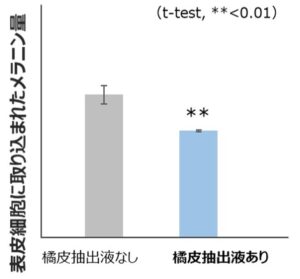 シミが発生するメカニズムの一つとして、メラノサイトで産生されたメラニンを表皮細胞が受け取り、細胞内に取り込むことがあげられる。このメラニンの取り込みは、表皮細胞が産生するPAR2というタンパク質によって促進されることが知られている。このPAR2はシミの周辺部にも存在しており、元々あるシミが広がっていく要因にもなり得る。そこで、「橘皮抽出液」を添加することでPAR2の産出量および表皮細胞のメラニン取り込み量がどう変化するかを検証した。