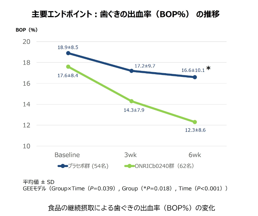 1.炎症の指標である歯ぐきの出血率(BOP%)について、乳酸菌ONRICb0240群ではプラセボ群と比較して有意な減少が認められた。乳酸菌ONRICb0240群では、開始時の17.6%から6週後には12.3%へと低下し、相対的に約30%の減少に相当した。