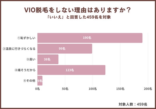 一方で、VIO脱毛を行わない男性に理由を聞いた結果、「恥ずかしい」「痛そう」と回答した方が多く、自分のデリケートゾーンを施術者に見られる事に抵抗感が強い模様です。